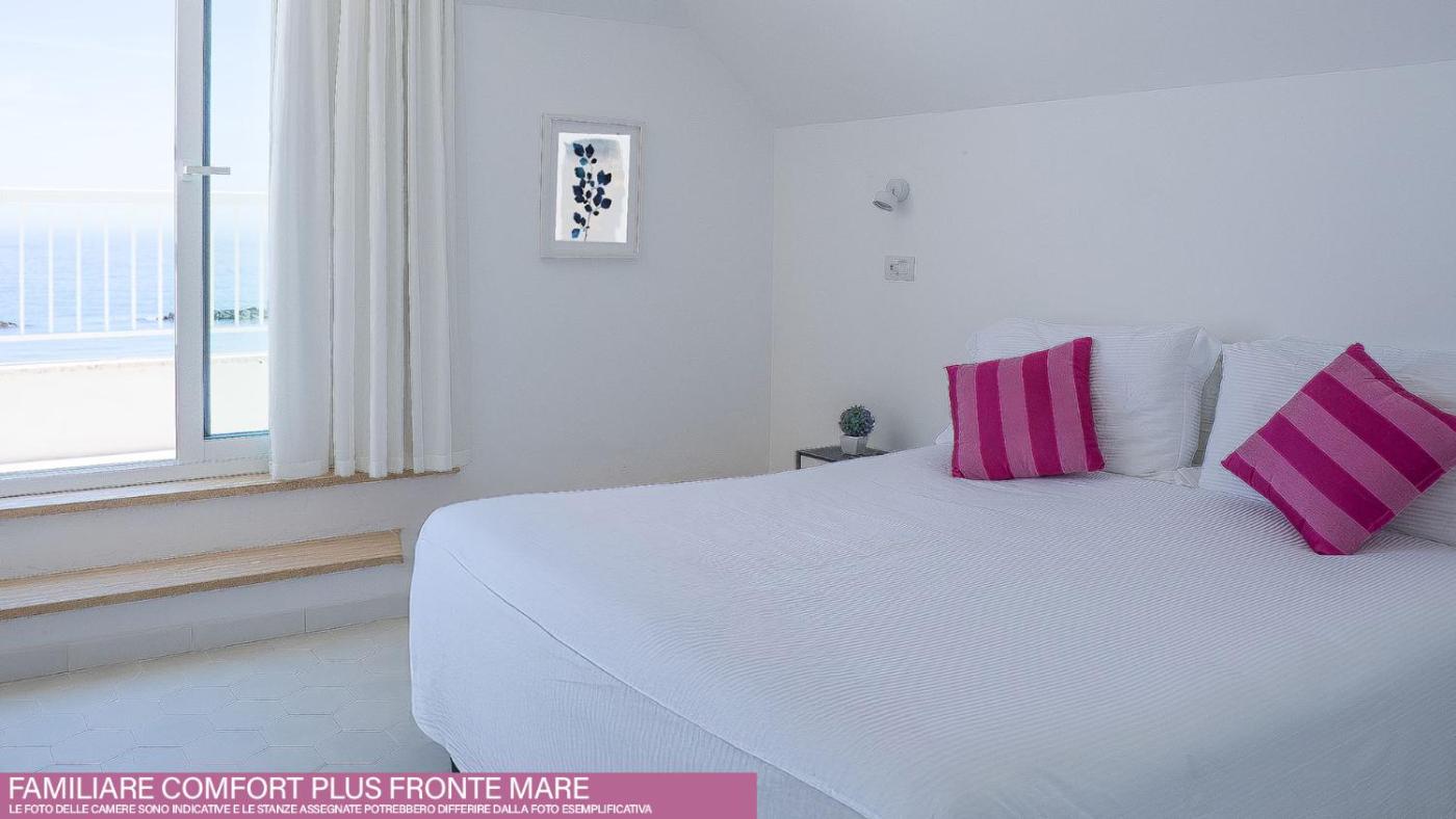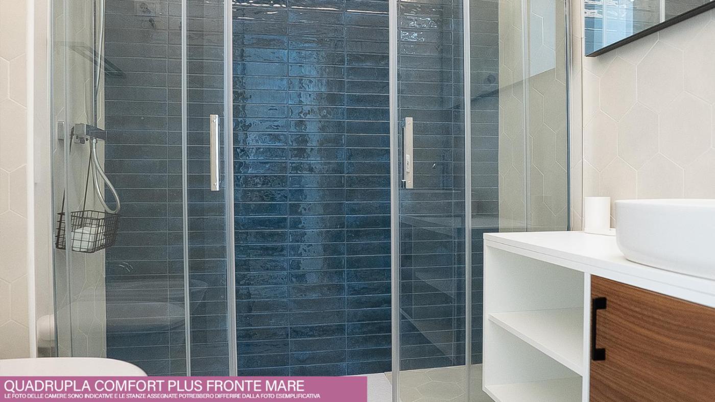 Camera Quadrupla con Vista Mare. Camera quadrupla climatizzata con armadio, balcone vista mare e bagno privato munito di doccia. L’alloggio dispone di 3 letti. ;